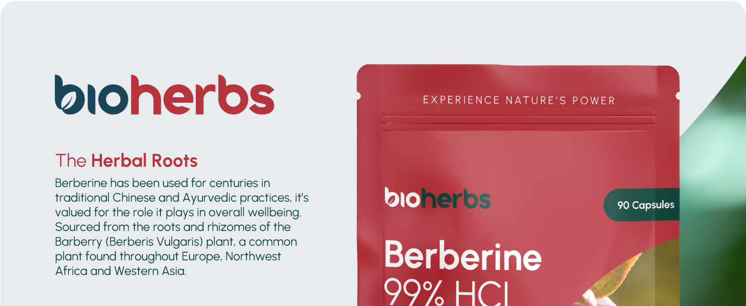 Berberine has been used for centuries in traditional Chinese and Ayurvedic practices, today it’s valued for the role it plays in overall wellbeing. Sourced from the roots and rhizomes of the Barberry (Berberis Vulgaris) plant, a common plant found throughout Europe, Northwest Africa and Western Asia.