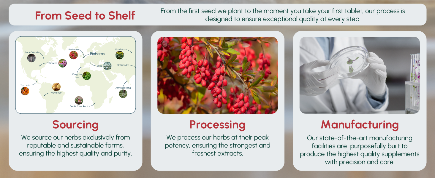 Our herbs truly are the crème of the crop, carefully selected from the best farms and locations around the world (hand-selected by us!). We focus on sustainable farming to guarantee the freshest, highest-quality ingredients for our herbal supplements.
