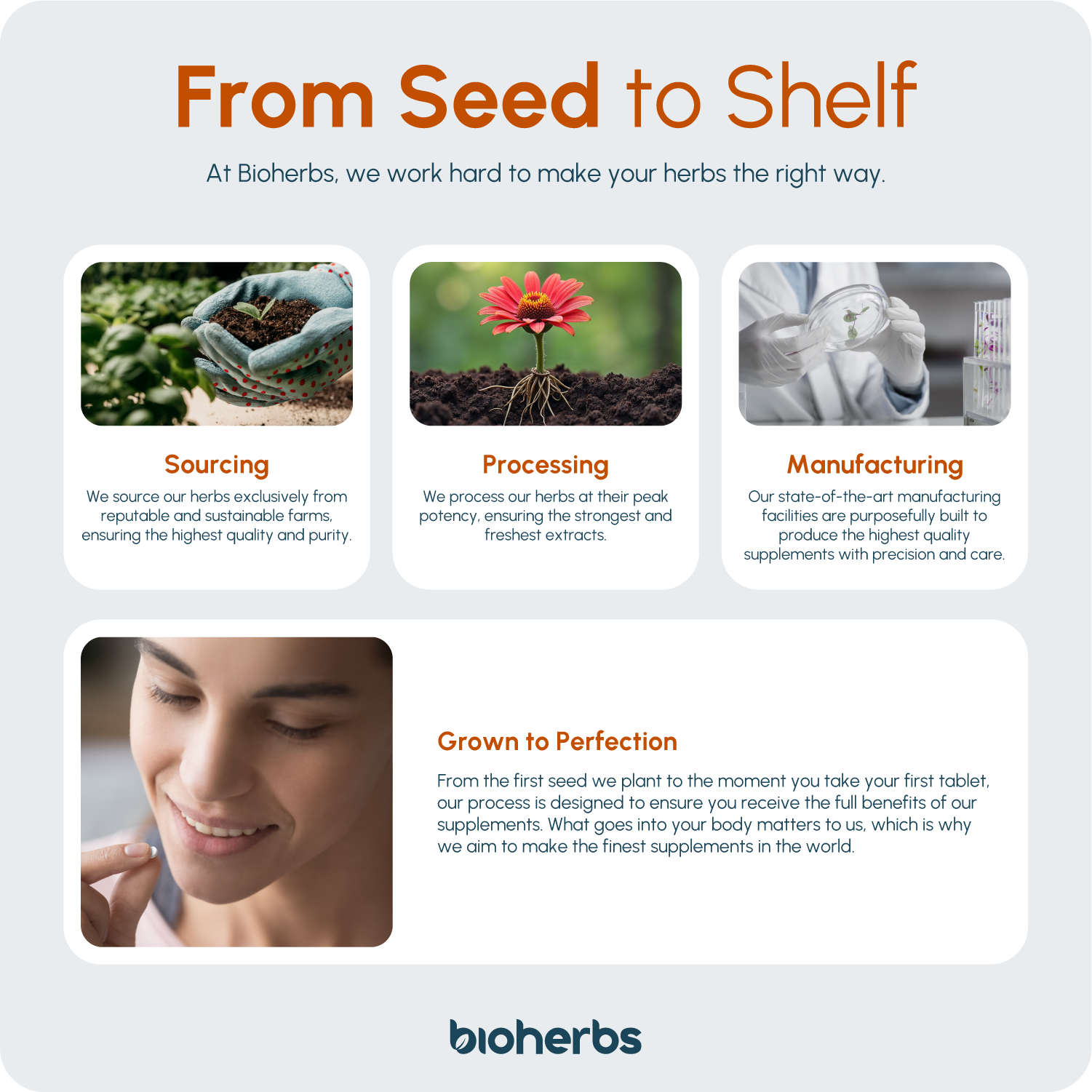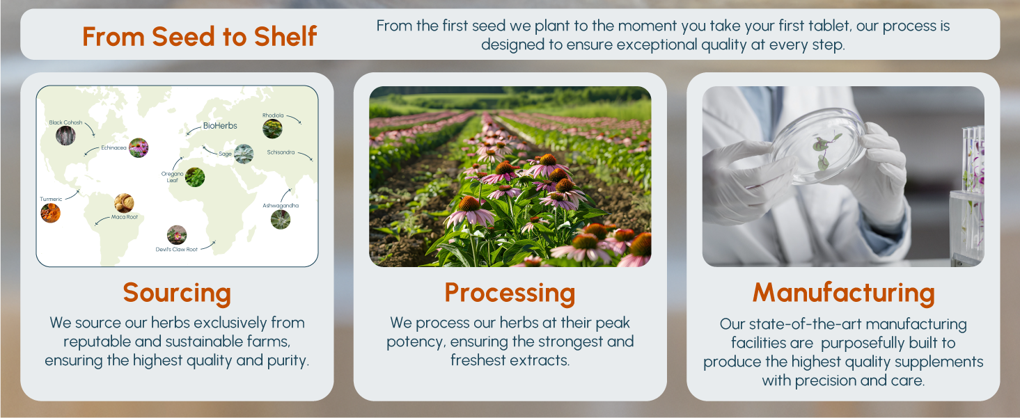 Our herbs truly are the crème of the crop, carefully selected from the best farms and locations around the world (hand-selected by us!). We focus on sustainable farming to guarantee the freshest, highest-quality ingredients for our herbal supplements.